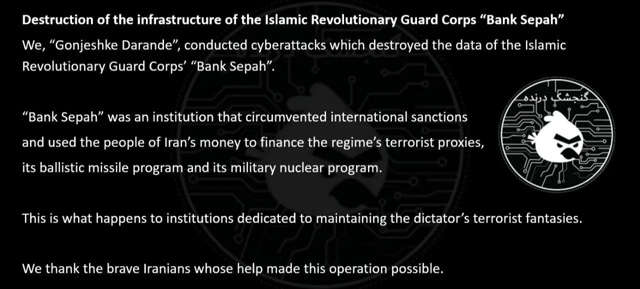 קבוצת “הדרור הטורף” שזוהתה בעבר עם האופוזיציה באיראן (ויש אומרים ישראל), מדווחת כי היא השחיתה את מאגרי המידע של בנק Sepah – הבנק המרכזי של המשטר האיראני.