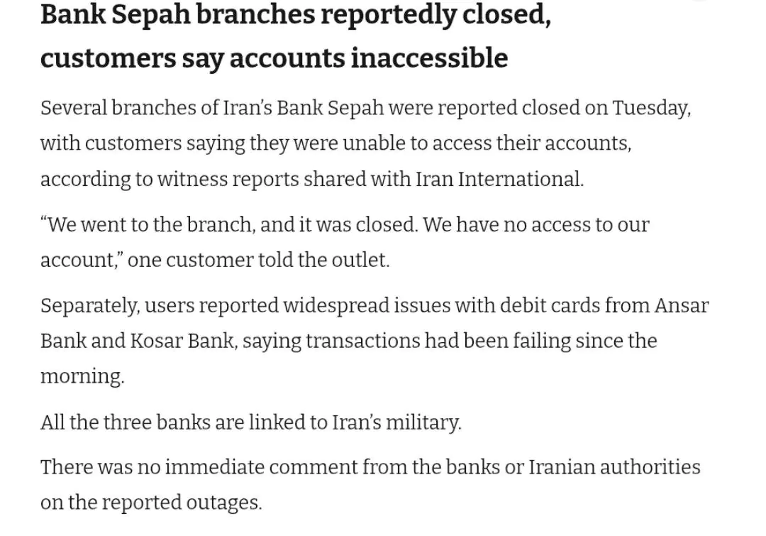 אתר איראן אינטרנשיונל מדווח כי סניפי בנק Sepah סגורים לפעילות וכי תושבים מדווחים שאין ביכולתם לגשת לחשבונות. .מלבד בנק Sepha מוזכרים גם שיבושים בבנקים Kosar ו-Ansar, המשויכים גם כן למשטר.