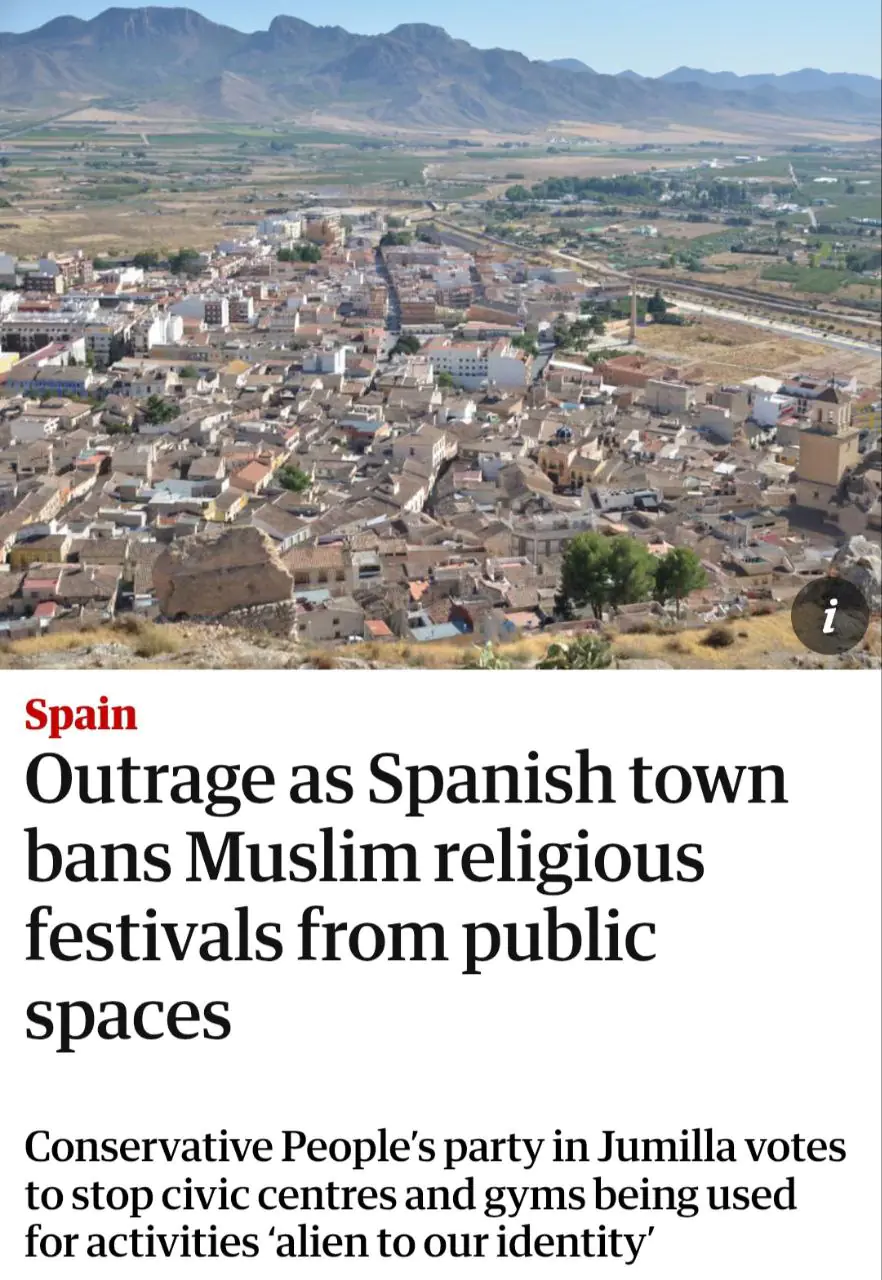 מועצת העיירה חומיליה (jumilla.org), הממוקמת צפונית למורסיה בדרום מזרח ספרד, העבירה באופן תקדימי איסור על קיום ארועים פומביים לציון חגים מוסלמים (כרמדאן, עיד אל-אד’חא ועוד). ההחלטה אוסרת על ציון חגים איסלאמיים במוסדות ציבור עירוניים, מרכזי תרבות וספורט (למעט ארועים שיקויימו ע”י העיריה) ותכנס לתוקף בשנת 2026. ההחלטה התקבלה ביוזמת נציגי מפלגת הימין Vox וזכתה לתמיכת חברי המועצה בנימוק, כי המהלך נדרש “להגנה על יחודיות האוכלוסיה המקומית”.