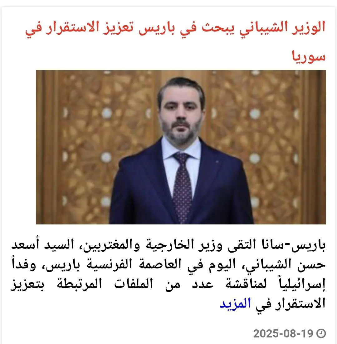 סוכנות הידיעות הסורית הרשמית מסרה שלשום  כי שר החוץ הסורי אסעד א-שייבאני נפגש בבירת צרפת פריז עם משלחת ישראלית כדי לדון במספר נושאים הקשורים לחיזוק היציבות באזור ובדרום סוריה. הדיונים לפי הדיווח התמקדו בהפחתת ההסלמה, אי ההתערבות בענייניה הפנימיים של סוריה, הגעה להבנות שיתמכו ביציבות באזור, מעקב אחר הפסקת האש בהר הדרוזים והפעלה מחדש של הסכם הפרדת הכוחות מ-1974. צוין שהדיונים מתקיימים בתיווך אמריקני במסגרת המאמצים הדיפלומטיים שנועדו לחזק את ביטחון ויציבות סוריה ולשמור על שלמותה הטריטוריאלית.