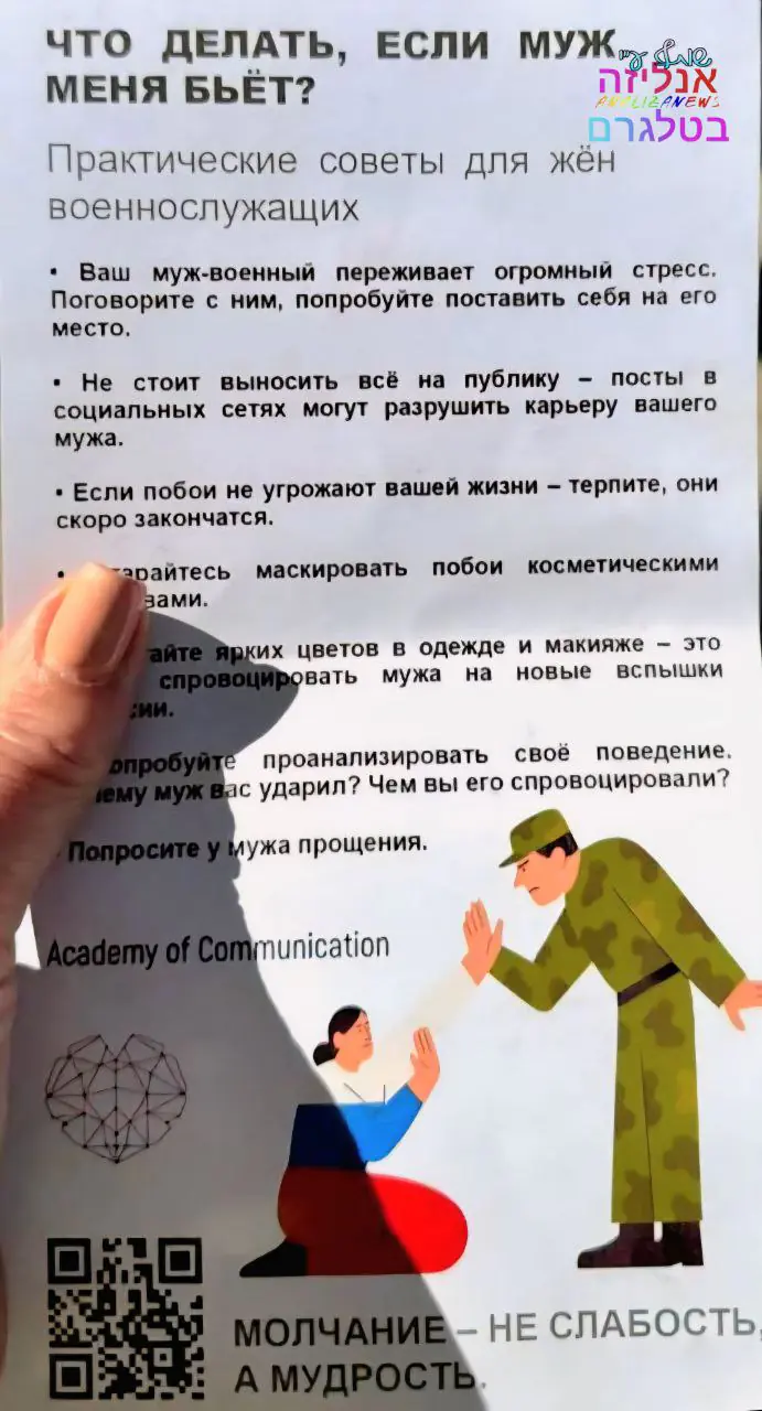 ברשת מופץ פרסום המיועד לכאורה לנשות הלוחמים הרוסיים ששבים הלומי קרב או טעוני תסכול ואלימות למשפחותיהם בעורף תוך גילויי אלימות כלפיהם:
