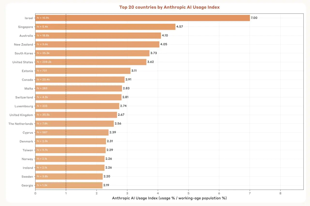 הדו”ח החדש של Anthropic Economic Index חושף שהשימוש ב-Claude מתרכז במדינות עשירות, כשהבולטת ביניהן היא ישראל – שנמצאת בראש מדד האימוץ העולמי ביחס לאוכלוסייה.