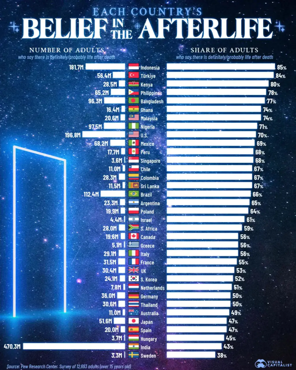 הדמיה זו מציגה את אחוז המבוגרים ב-36 מדינות שאומרים שיש “בהחלט” או “כנראה” חיים לאחר המוות.