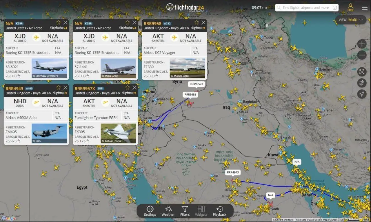 * מכליות תדלוק: זוהתה תנועה חריגה של למעלה מ-30 מכליות תדלוק (KC-135 ו-KC-46) מארה"ב ומאירופה. זהו "סמן המלחמה" המשמעותי ביותר, שכן הוא מעיד על הכנה לתקיפות ארוכות טווח של מטוסי קרב ומפציצים.