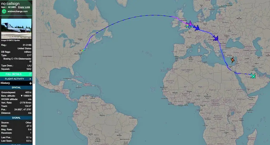 * רכבת אווירית של מטוסי תובלה: למעלה מ-30 מטוסי C-17 Globemaster III זוהו כשהם בדרכם למזרח התיכון. לפחות 8 מהם נחתו בבסיס RAF Fairford בבריטניה (תחנת מעבר קלאסית לפני פריסה אזורית).
