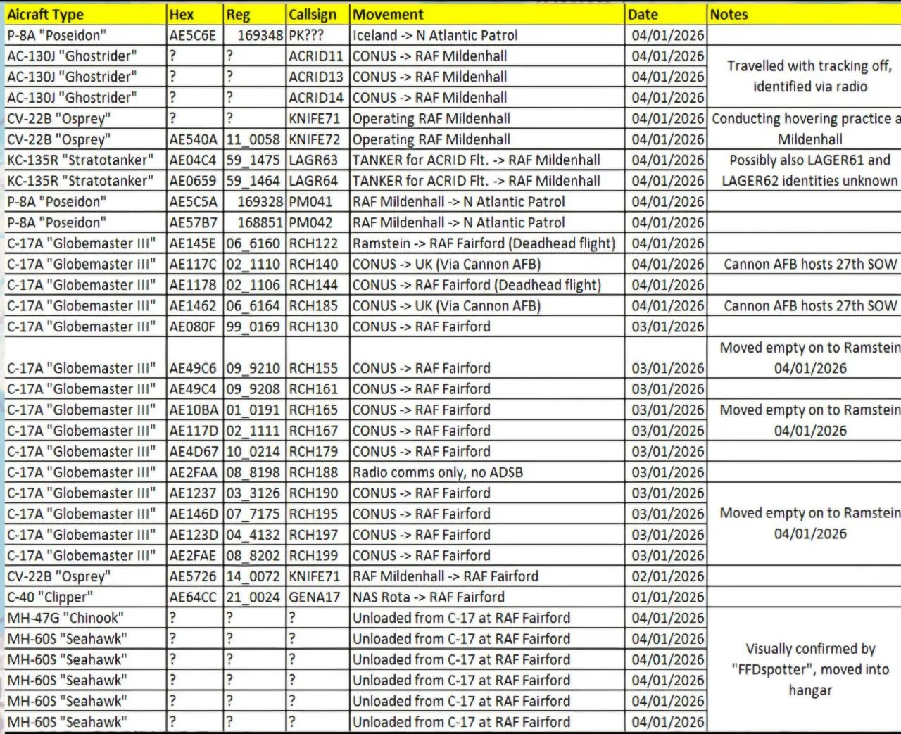 **- דיווח אחרון: בשעה האחרונה זוהו אותות קריאה (Callsigns) של מטוסי תובלה כבדים מסוג C-17 שנוחתים ברצף בבסיסי חיל האוויר בבריטניה, ככל הנראה בדרך לפריסה סופית באזורנו.