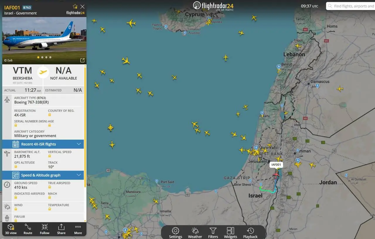 המטוס עזב את המרחב האווירי של ישראל ב-14 בינואר, וטס מעל הים התיכון לאחר שהמריא מבסיס חיל האוויר נבטים ליד באר שבע, על פי אתרי אינטרנט