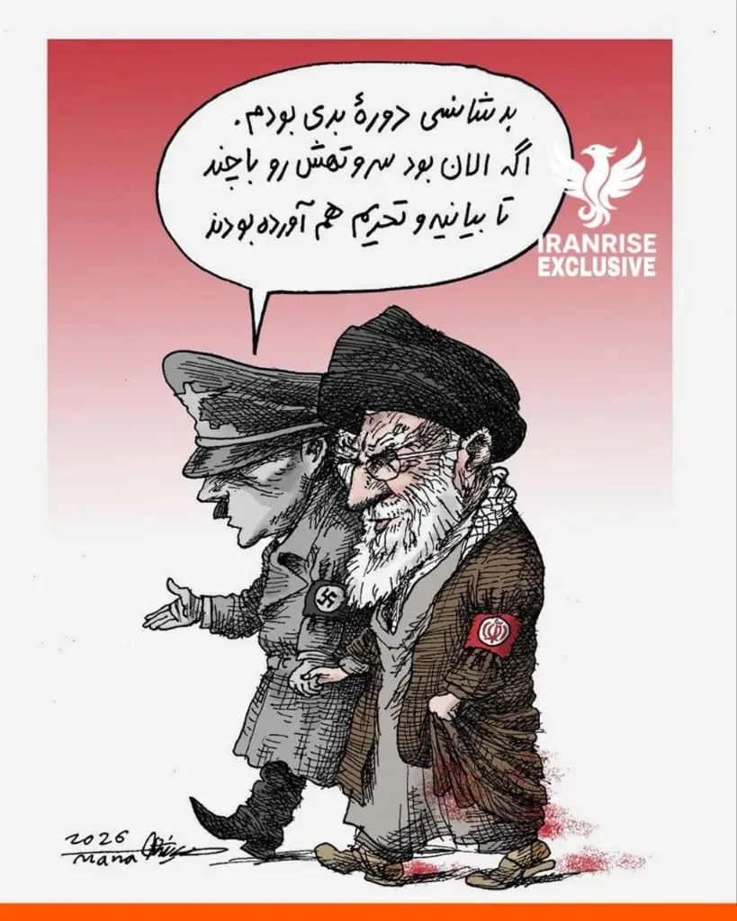 קריקטורות היטלר לחמינאי: "איזה חוסר מזל, הייתי בתקופה גרועה. אם זה היה עכשיו, הם היו גומרים את העניין עם כמה הצהרות וסנקציות" 23/01/202623/01/2026 Nziv איראן, נאצים קרדיט: מַאנַא נֶיֵסְתַאנִי -IranRise. פורסם בערוץ נעם בנעט – שפת הקריקטורות במזרח התיכון | אֻסְכֻּת