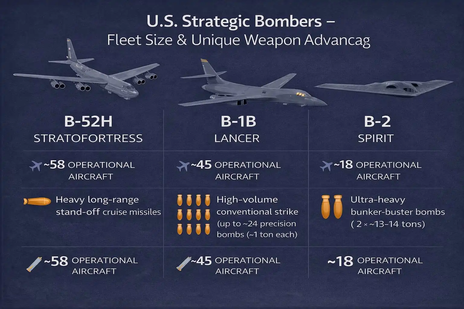 מטוסי ההפצצה האסטרטגים של ארה"ב נושאים בכל גיחת הפצצה אחת עשרות טונות של חימוש ומתמקדים בעיקר בחימושים הכבדים ביותר, טילים ופצצות מדויקות.
