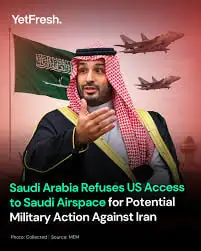 - בפומבי: יורש העצר מוחמד בן סלמאן הצהיר (בשיחה עם נשיא איראן פזשכיאן ב-27 בינואר 2026) כי סעודיה לא תאפשר שימוש במרחב האווירי או בשטחה לצורך תקיפה באיראן. זאת במטרה להגן על עצמה מפני תגובה איראנית ישירה ולשמור על הסכם הנורמליזציה שנחתם ב-2023.