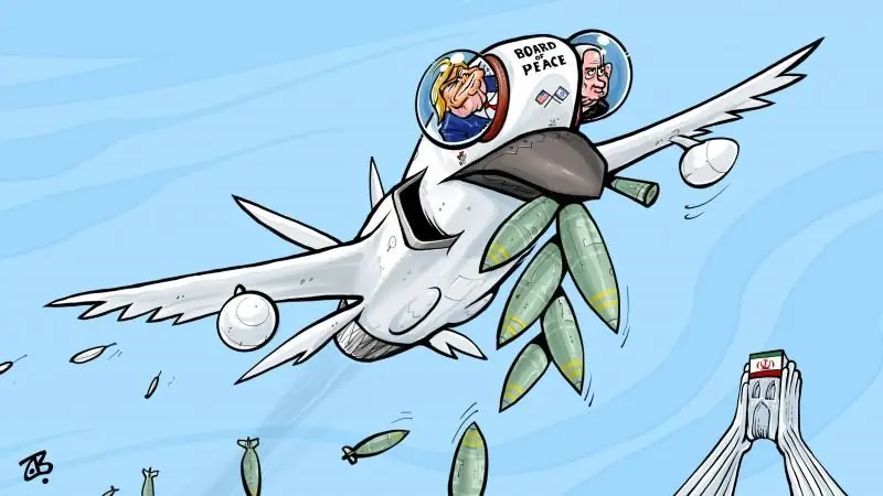 קריקטורות חברי מועצת השלום ( נתניהו וטראמפ) מפציצים את איראן 01/03/2026 Nziv איראן, ארה"ב, ישראל קרדיט: קריקטורה מווומנט