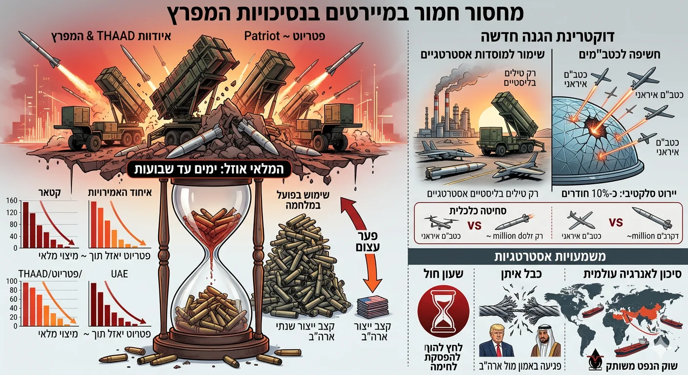 - לחץ להפסקת הלחימה: המחסור המיידי דוחף את מדינות המפרץ להפעיל לחץ על וושינגטון לסיים את המבצע הצבאי מול איראן, מחשש שיישארו ללא הגנה תוך ימים ספורים.