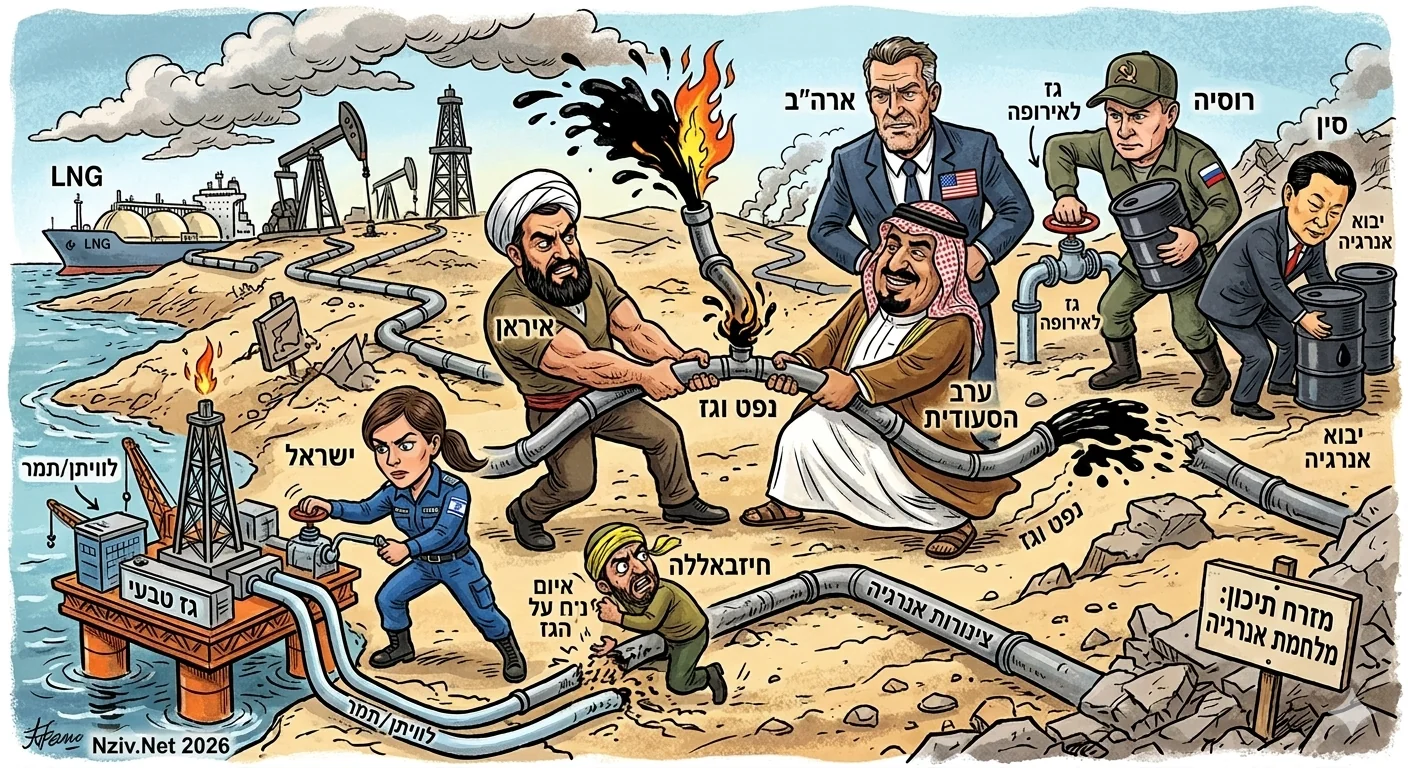 קריקטורות מקורות האנרגיה במזרח התיכון: מלחמת הכל בכל 19/03/2026 Nziv ארה"ב, גז טבעי, המזרח התיכון, חיזבאללה, ישראל, לבנון, נפט, סין, סעודיה, רוסיה
