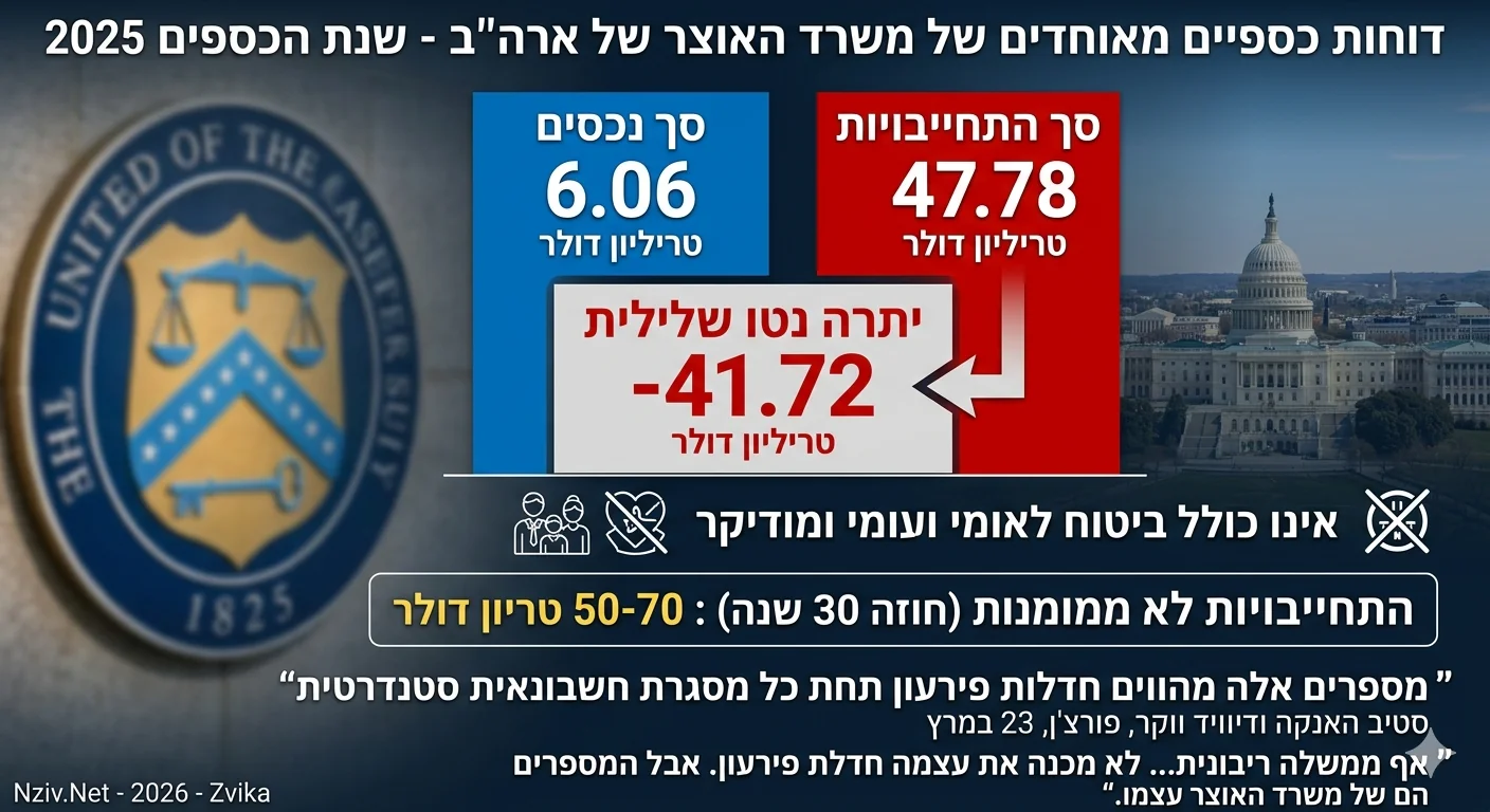 הדוחות הכספיים המאוחדים של משרד האוצר של ארצות הברית לשנת הכספים 2025 מדווחים על סך נכסים של 6.06 טריליון דולר לעומת סך התחייבויות של 47.78 טריליון דולר.