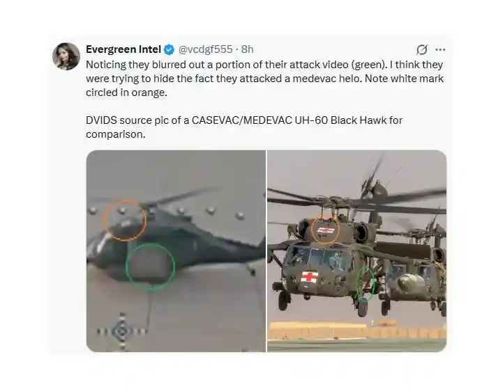 האנליסט השווה את הסימונים על המטוס לתמונות הזמינות לציבור של מסוקי UH-60 המצוידים לפינוי רפואי ואווירי, דבר המצביע על כך שייתכן שכלי הטייס הוא דגם HH-60M המשמש למשימות פינוי רפואי.