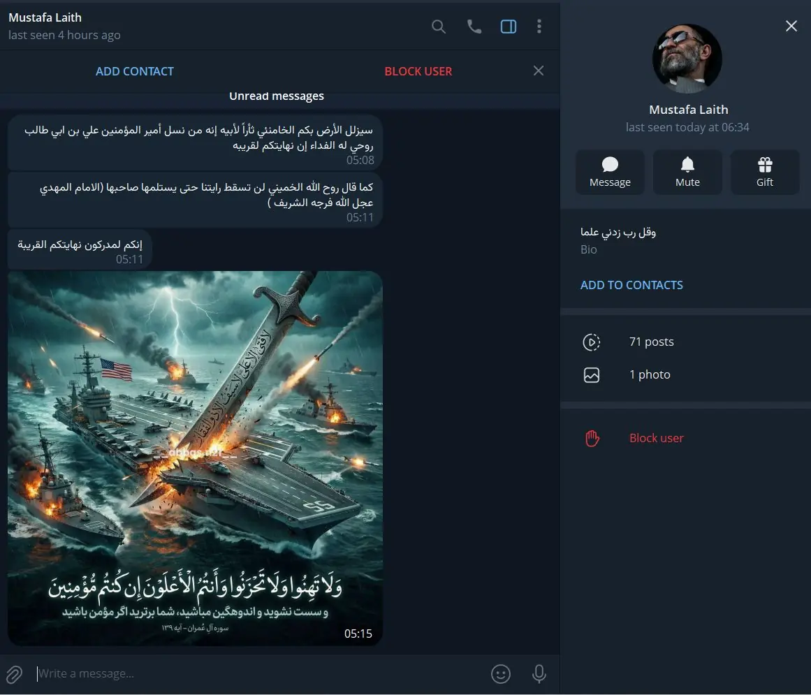 מעט אחרי 5 לפנות בוקר, נשלחו אלי הודעות ממשתמש טלגרם עיראקי שבחר לעצמו את השם Mustafa Laith, שלח לי הודעות פרטיות, הצצתי בהודעות וראיתי שמדובר בניסיון הפחדה, וחזרתי לישון.