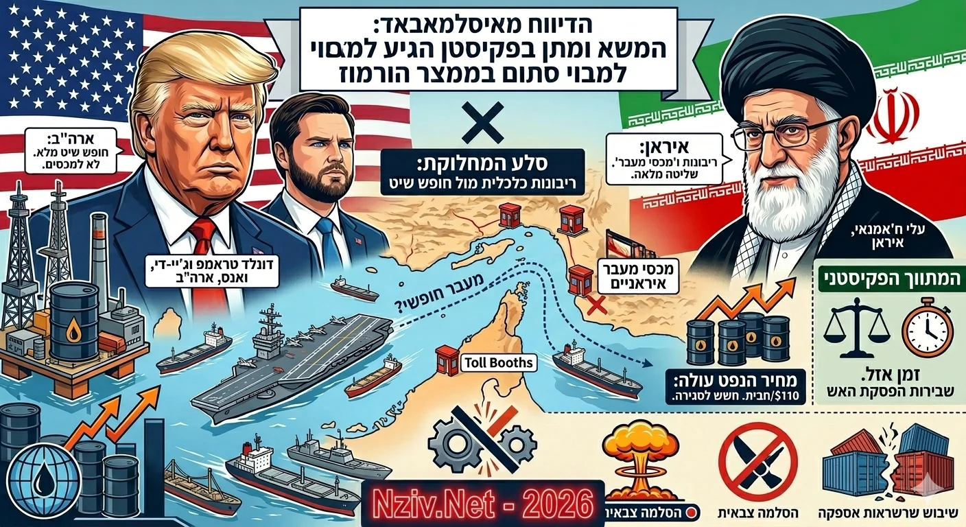 הדיווחים מאיסלמאבאד היום (11 באפריל 2026) מאשרים כי המשא ומתן בין ארצות הברית לאיראן הגיע למבוי סתום (Deadlock), כאשר סוגיית השליטה במצר הורמוז הפכה לסלע המחלוקת המרכזי המאיים על המשך הפסקת האש.
