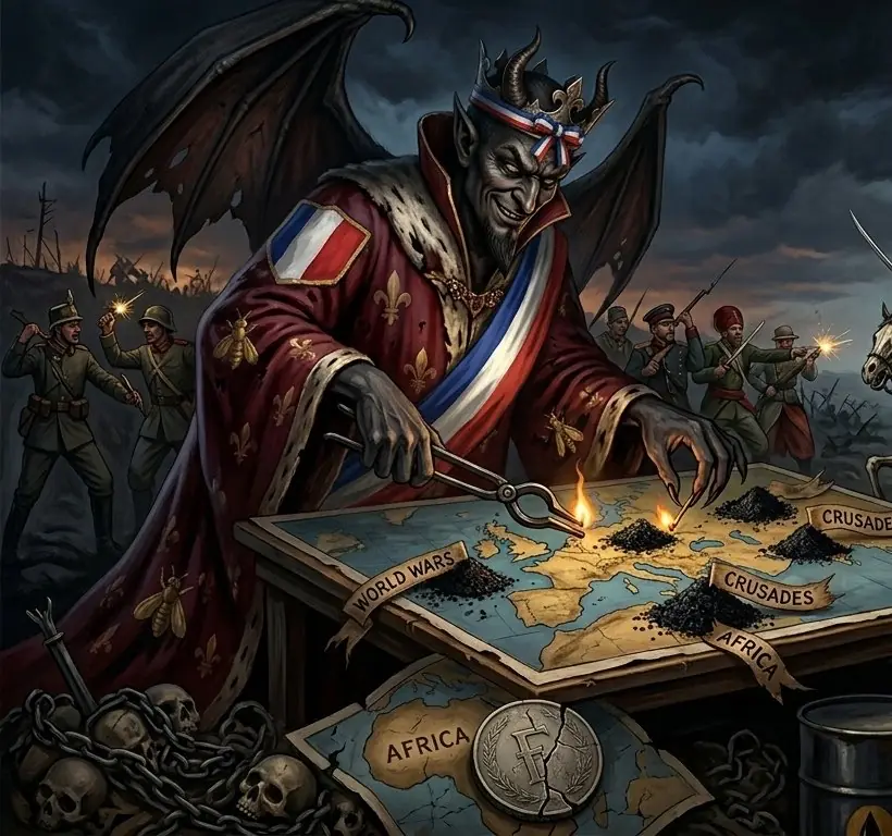 *- המציאה מטבע (הפרנק האפריקאי) כדי להבטיח את המשך בזיזת אוצרות הטבע של 14 מדינות אפריקאיות גם לאחר עצמאותן הפורמלית תוך שהיא קושרת את כלכלת המדינות לכספת הצרפתית לנצח .