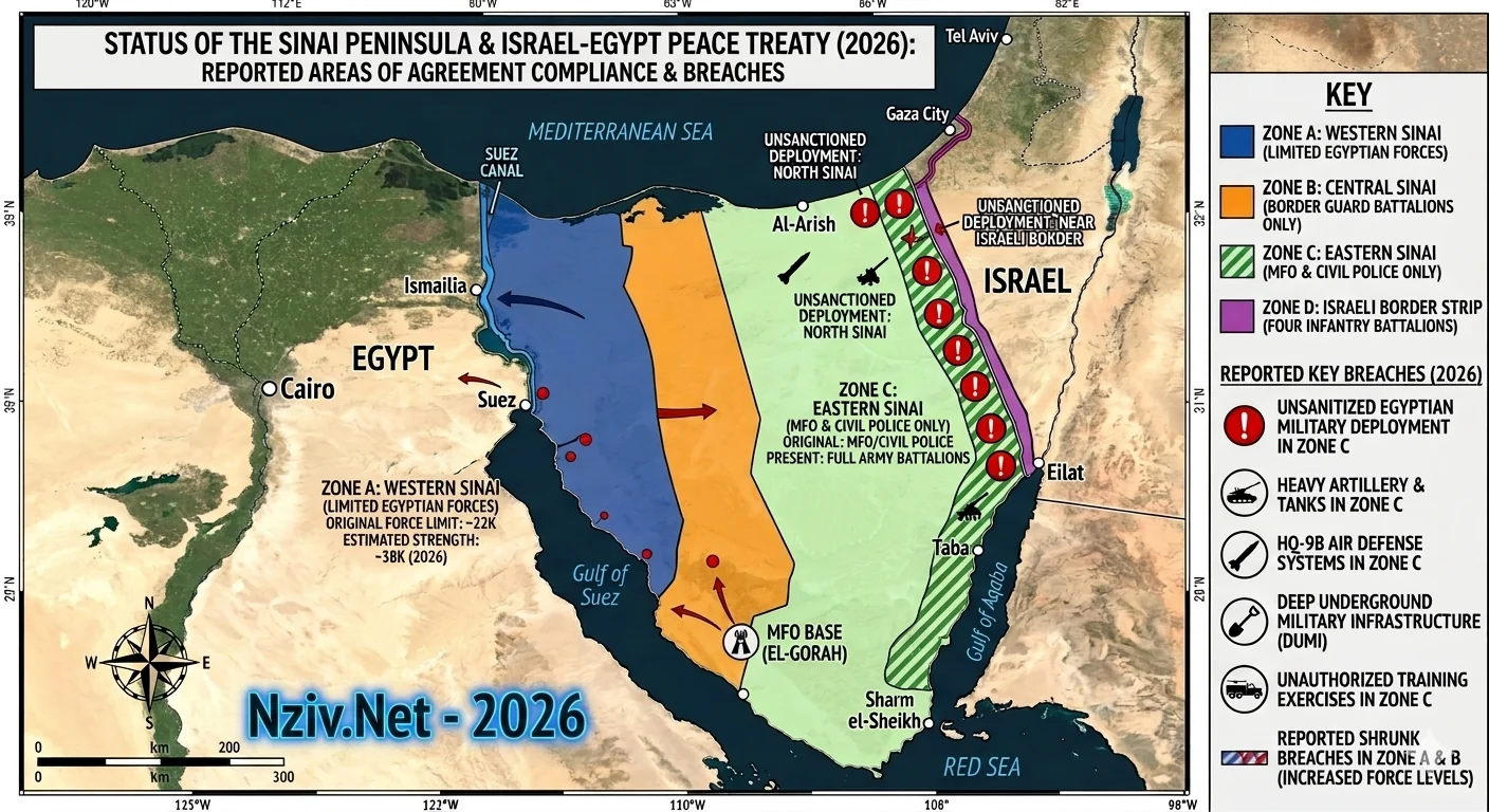 • אזור C (מזרח סיני והגבול): אזור המשטרה האזרחית. זהו האזור שבו מתבצעות ההפרות החמורות ביותר, כולל הצבת מערכות הגנה אווירית מתקדמות (כמו HQ-9B), פריסת חטיבות צבא סדירות ובניית תשתיות צבאיות קבועות בתוך בטן ההרים (כמו בג'בל אל-חלאל).