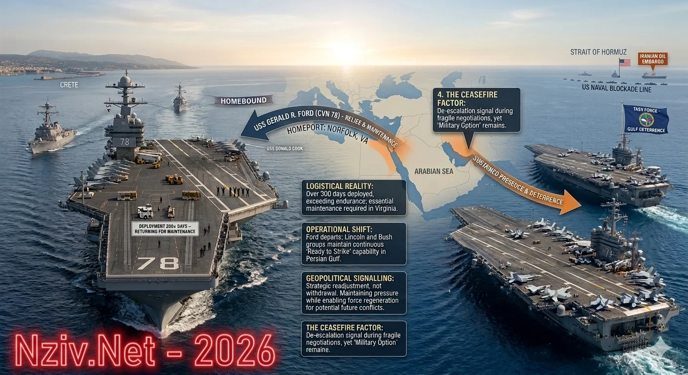 עזיבת נושאת המטוסים USS Gerald R. Ford (CVN-78) את המזרח התיכון, כפי שדווח ב-29-30 באפריל 2026, היא אירוע בעל משמעויות לוגיסטיות ואסטרטגיות כבדות משקל, אך לאו דווקא איתות על נסיגה אמריקנית מהאזור.