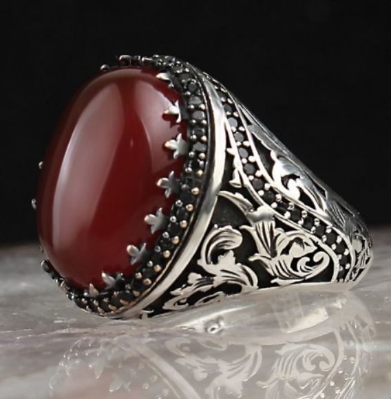 טבעת כסף משובצת אבן אודם (יאקוט), סוג של אבן קוורץ המוכרת בשם קרנליאן, המכילה ברזל הנותן לה את הצבע האדום, שבנוסף לדברי האימאם עלי בחדית, מוזכרת גם הקוראן (58;55)