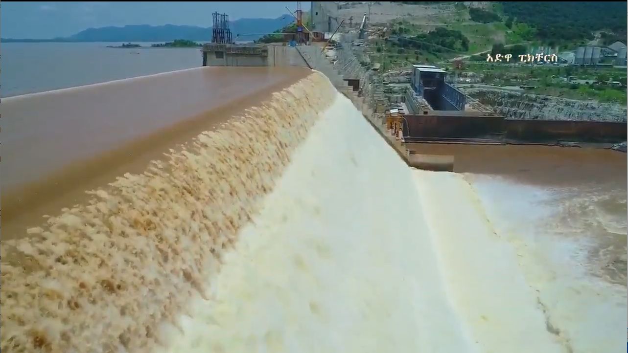 תחילת זרימת מי הנילוס מעל המגלש המרכזי (spillway) מציינת גמר השלב הראשון של מילוי המאגר, שהגיע לגובה מים המאפשר זרימה חופשית של הנהר מעל המגלש המרכזי בין חלקי הסכר.