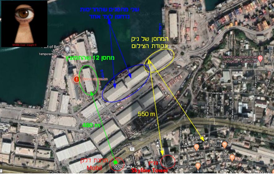 המעט שאני יכול לעשות לפי התמונות והסרטונים המתפרסמים והמיוחסים למחסן שבו נראית האש והפיצוצים הקטנים לפני הפיצוץ הראשון, שהקדים לפיצוץ הגדול, ואם לוקחים נקודת ייחוס כגון בניין Skyline Tower הנמצא מול נמל ביירות כ 550 מהרציף והמחסן, כפי שתראו בתמונה המצורפת, ואת הבניין העגול שמצפון לו, ומבנים נוספים הנראים בתמונה, ניתן לקחת מהם אזימוט חוזר כדי לזהות את נקודת הצילום ואת המחסן שבצילום.