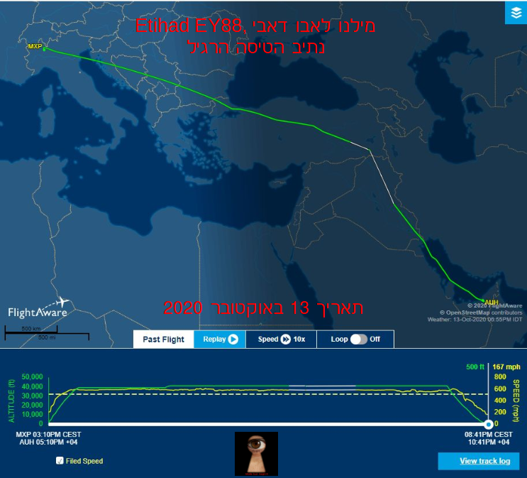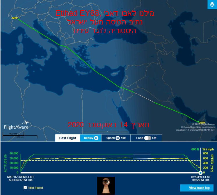 שתי התמונות המצורפות, הן של נתיב הטיסה, לאותה הטיסה ואותו המטוס, ממילנו לאבו דאבי, תמונה אחת שעשתה היסטוריה ב 14 באוקטובר, טיסה החוצה את המרחב האווירי של ישראל.