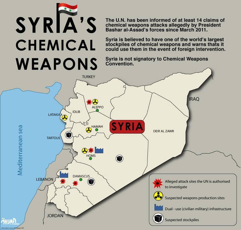 ההערכות הן כי לסוריה יש את מלאי הנשק הכימי הגדול בעולם והיא אף איימה כי היא תעשה בו שימוש במקרה ומדינה זרה תפלוש לשטחה.