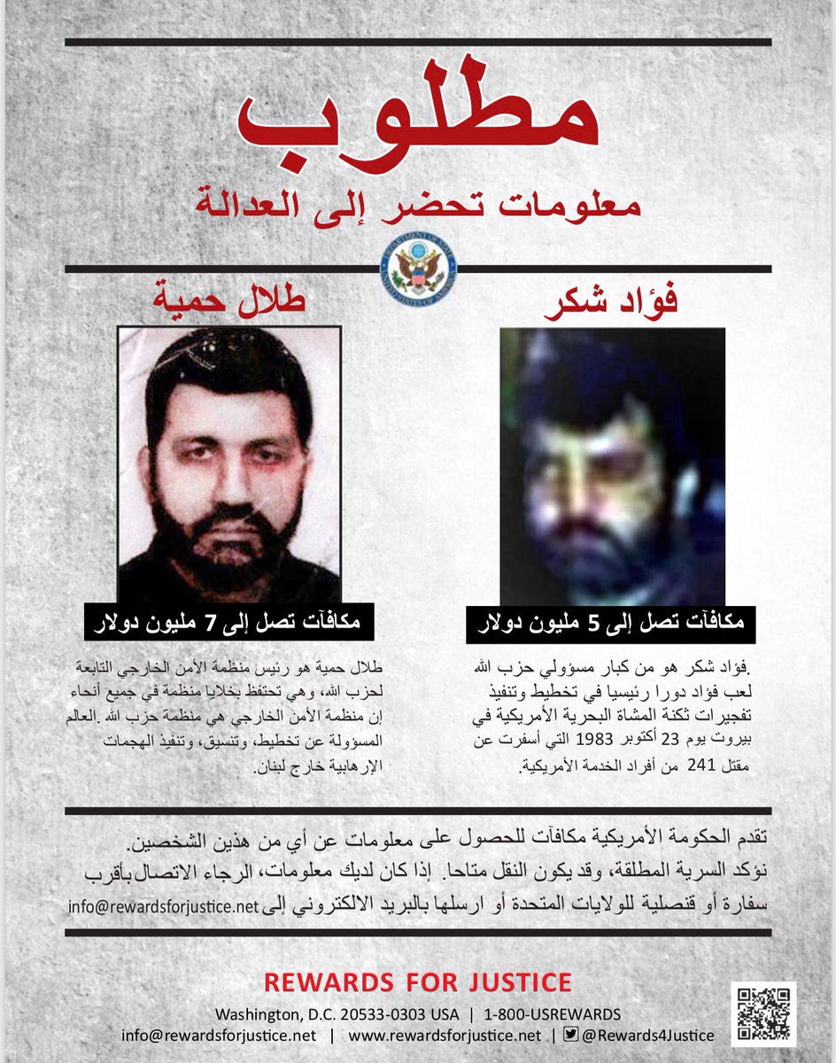 *- מודעת המבוקש אחרי 2 בכירי חיזבאללה שעל ראשיהם הושת פרס כספי גדול על ידי ארה”ב: