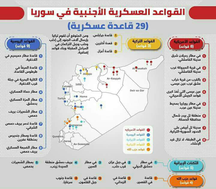 מפת 29 הבסיסים הצבאיים הזרים על אדמת סוריה.