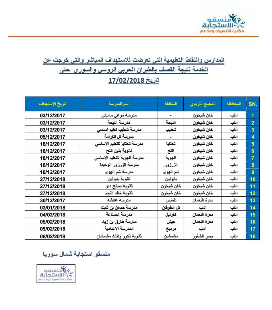 *- רשימת 18 בתי ספר במחוז אידליב בצפון סוריה שיצאו משימוש עקב הפצצות רוסיות וסוריות: