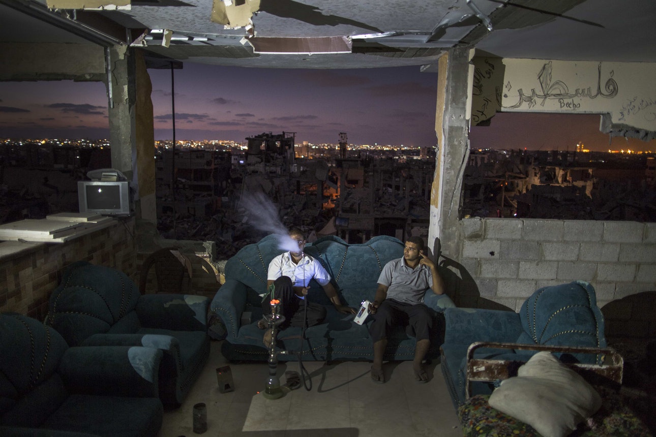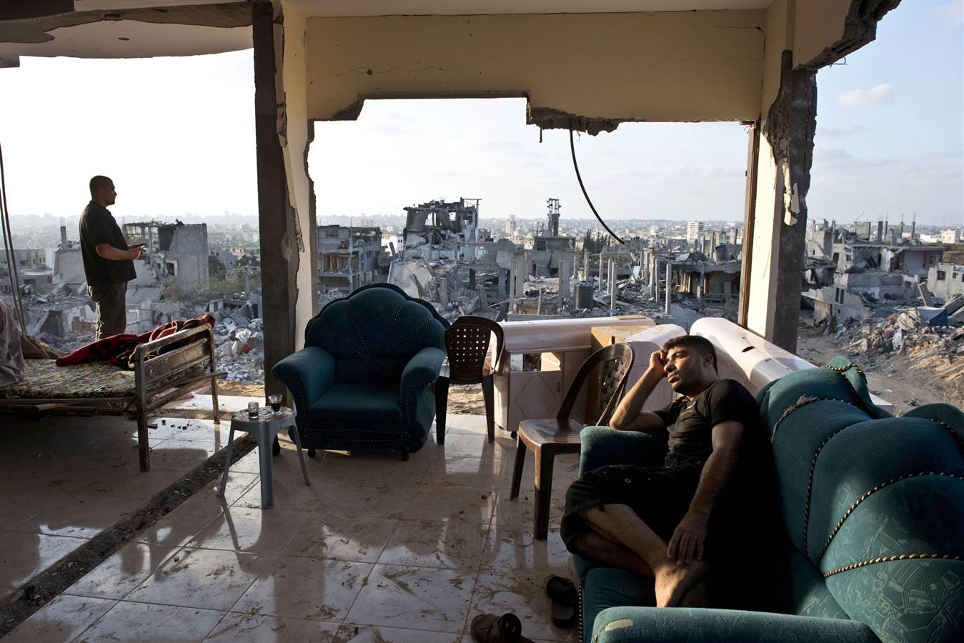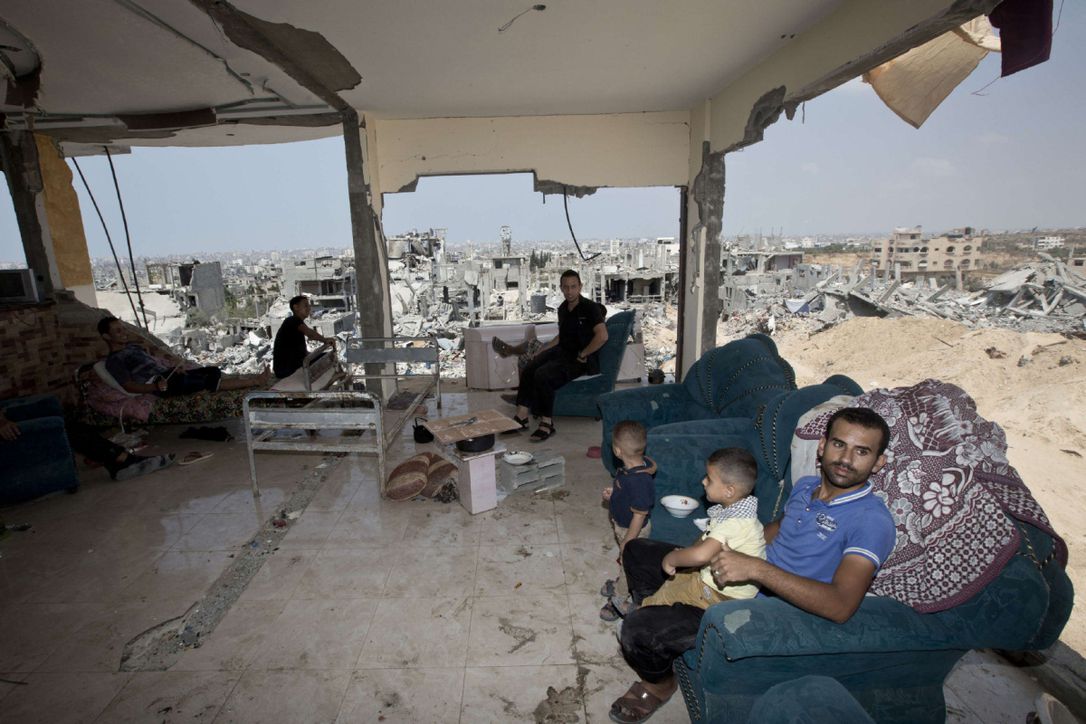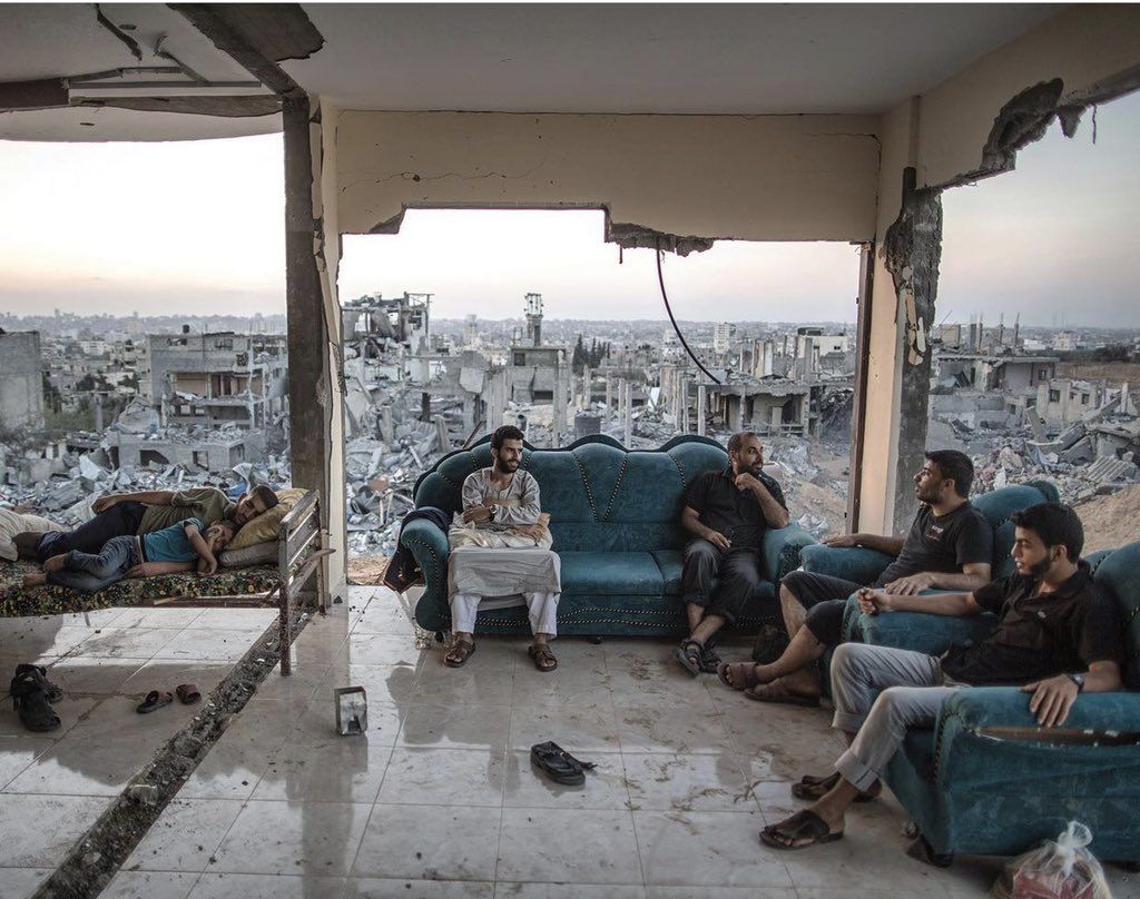 קרדיט לתמונות האנשים היושבים על כורסאות בבית הרוס בעזה: מהרשתות החברתיות, צילום של הצלם העזתי ויסאם נסאר = وسام نصار= Wissam Nassar