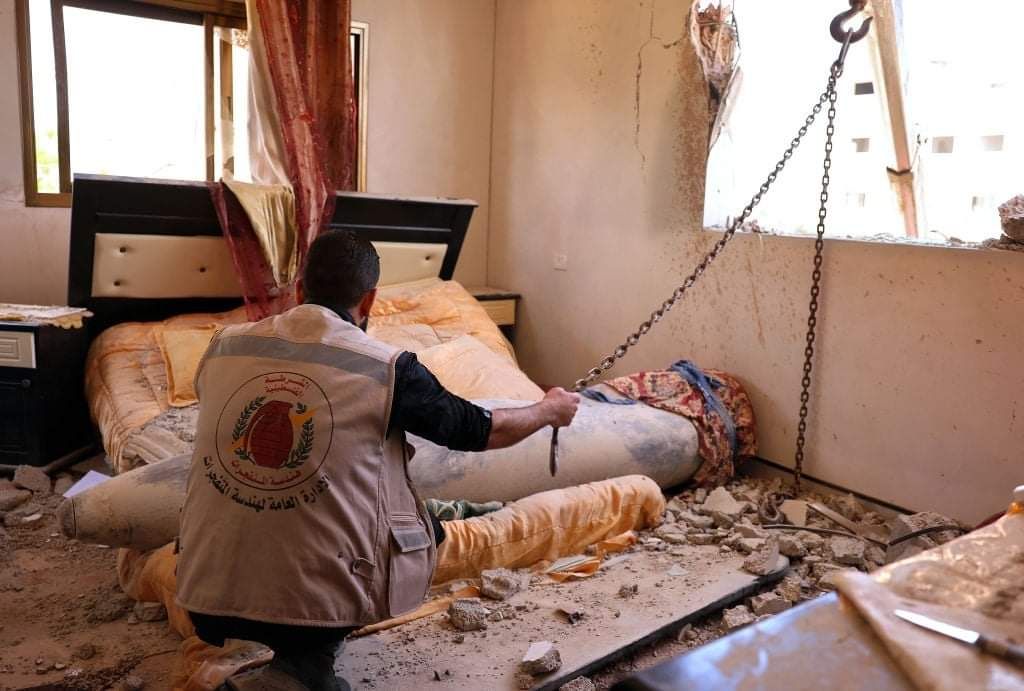 זו הסיבה שבחלק מהתמונות שבהן רואים בימים האחרונים את הפצצות הישראליות, רואים שהחלק האחורי של הפצצה עטוף בשמיכה או שטיח, פשוט כדי למנוע מחומר הנפץ ליפול במהלך ההעברה “למתקן הטיפול” בנפלי אמל”ח ישראלי…