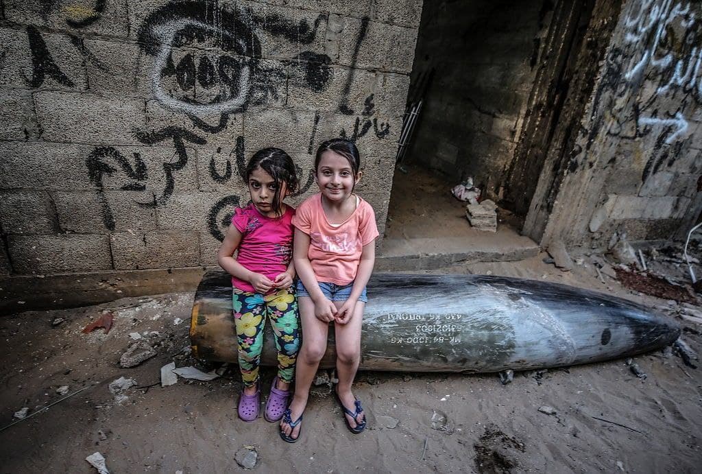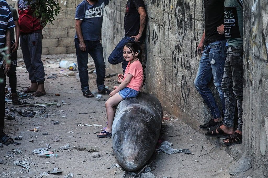 • תמונת ילדים יושבים על פצצה ישראלית שלא התפוצצה