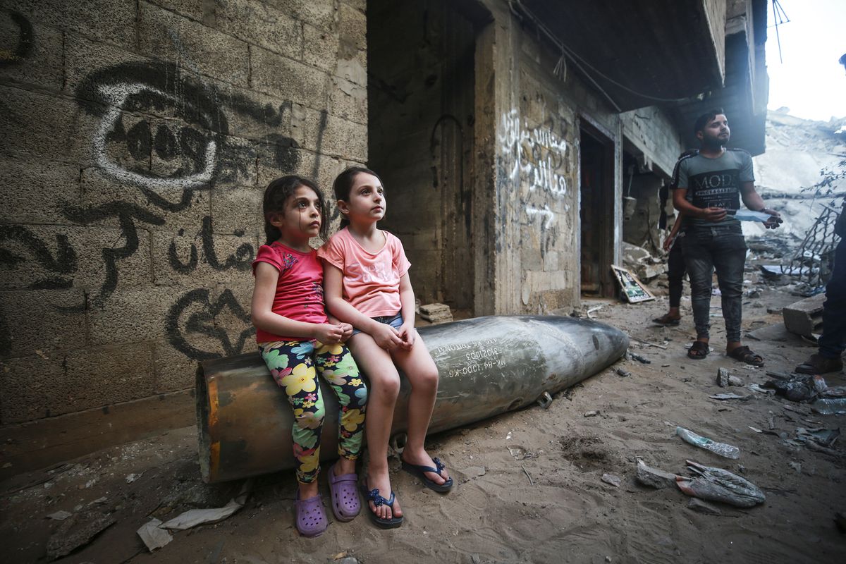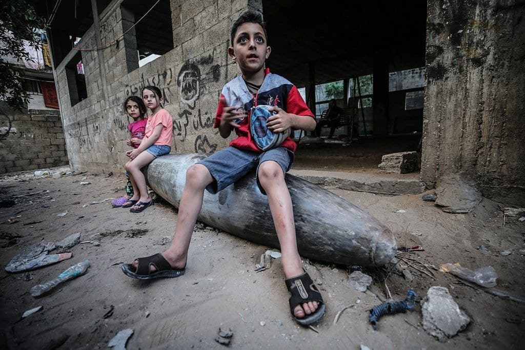 קרדיט לתמונות של ילדים יושבים על פצצה: מהרשתות החברתיות, צילום של הצלם העזתי מוסטפה חסונה = مصطفى حسونة = Mustafa Hassona