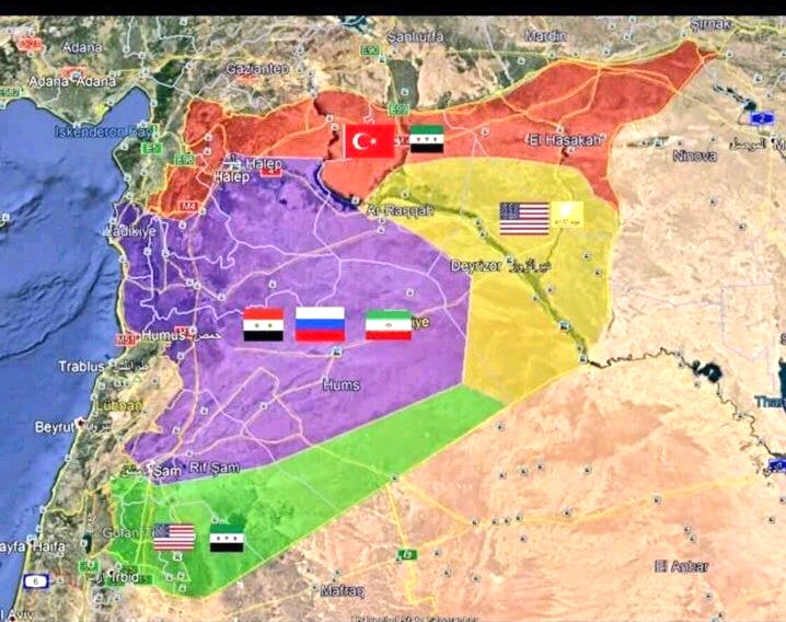 *- אחד האתרים הערביים פרסם מפה זאת המראה את הפתרון הצפוי לסוריה. כל אחד קורע חלק מאדמת סוריה למען האינטרסים הקריטיים שלו .