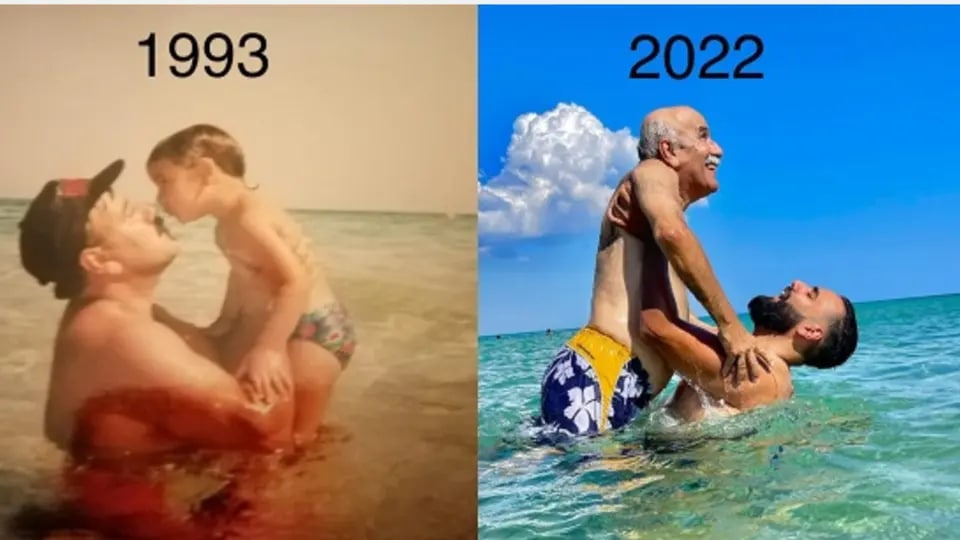 תמונה של צעיר נושא את אביו הקשיש בזמן ששחו בים, מול תמונה שצולמה לפני 29 שנים, כשהיה צעיר ואביו נשא אותו לים, הציתה אהדה רבה גם בקרב חלוצי אתרי הרשתות החברתיות במצרים.