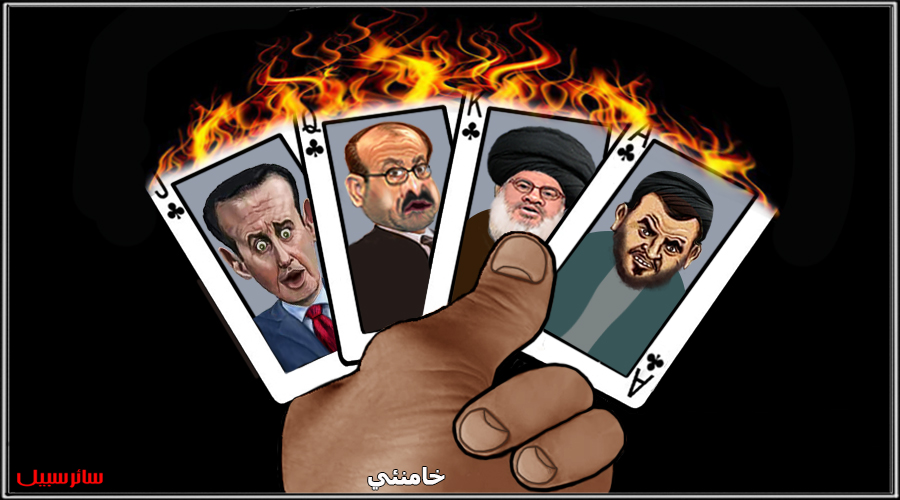 קריקטורות הקלפים “המנצחים” שבידי חמינאי האיראני 20/01/2023 Nziv איראן, חות'ים, חיזבאללה, סוריה, עירק (החות’ים , חיזבאללה , אלמליכי העיראקי ואסד הסורי) קרדיט: סאיר סביל
