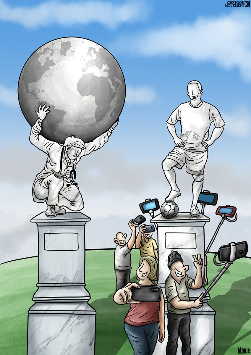 קריקטורות פולחן הגיבורים בעצם הימים האלו 10/04/202309/04/2023 Nziv רפואה אחרי שהרופאים הצילו את העולם מנגיף הקורונה…. עכשיו הם נשכחו לטובת כוכבי הכדורגל…. קרדיט: Miguel Morales Madrigal