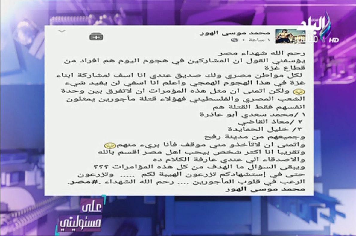ממשל החמס נאלץ גם להוציא הודעה בו הוא מצטער שבני עזה השתתפו במתקפה על צבא מצרים ומגלים את שמם: