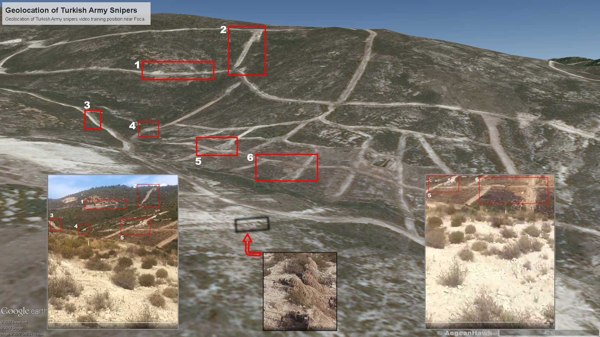 גם צבא טורקיה וגם צבא יוון פרסמו תמונות של אימון צלפים שכזה וקבוצה המתמחה בניתוח המידע הגיאוגרפי -Geolocation – הניבט מהתמונה והעוזר לקורא הרגיל להתמצא בשטח מנתחת את התמונה להנאת הקורא.