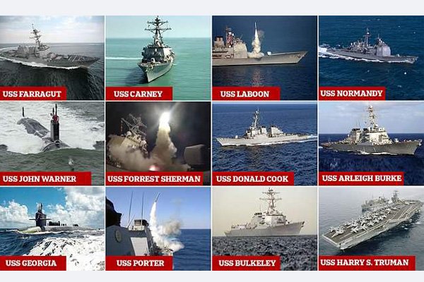 המשחתת האמריקאית דונלד קוק ,הנושאת 60 טילי שיוט כבר תפסה עמדות ירי במימי הים התיכון יחד עם עוד 3 משחתות נוספות .נושאת המטוסים הארי טרומן יצאה מארה”ב וגם היא בדרכה לאזור הים התיכון כשעל סיפונה 90 מטוסי קרב מלווה ב-5 אניות קרב המצויידות בטילי שיוט טומהוק המתקדמים ביותר כיום בארסנל הנשק האמריקאי ובעלי דיוק פגיעה טוב במיוחד.