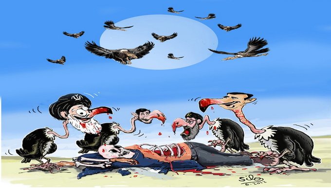 החוּת’ים החוטאים – הקריקטורה השבועית של עידית – מתוך עיתון אלאתִחַאד الاتحاد , איחוד האמירויות השבוע תקפו המורדים החות’ים בתימן בסיס