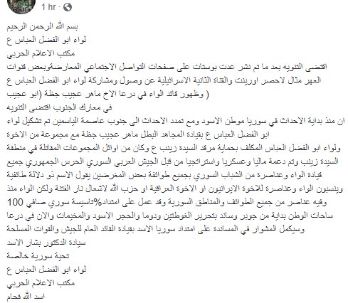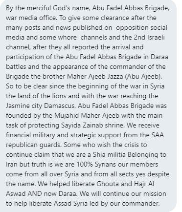 חטיבת אבו אלפאדל אלעבאס אף הוציאה הודעת הבהרה מפורטת המדגישה את היות כל הלוחמים ממוצא סורי ואין שחר לידיעות המתפרסמות כאילו הם מקבלים את הפקודות שלהם מאירן ולוחמיהם הם ממוצא שיעי.