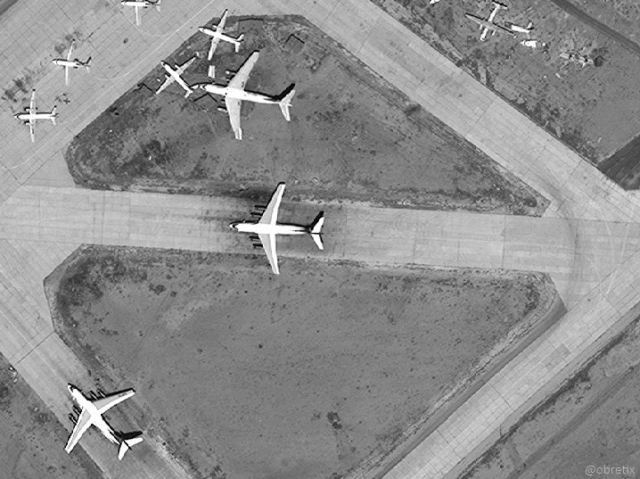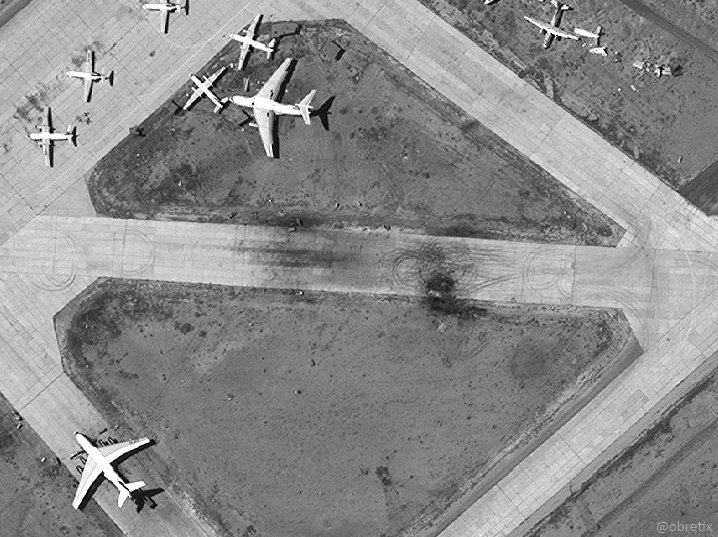 צילום לויין של מטוס על מסלול בשדה התעופה הבין לאומי של דמשק חושף כי יתכן והיתה פגיעה במטוס על המסלול שרואים בן כתם של שריפה.
