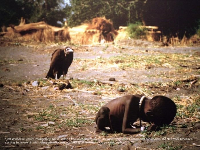 Pulitzer Prize for Photography 1994: Kevin Carter – For feature photography depicting the Sudanese famine. This photo shows a girl crawling to the feeding center as a vulture waits nearby. The photographer committed suicide shortly after this.