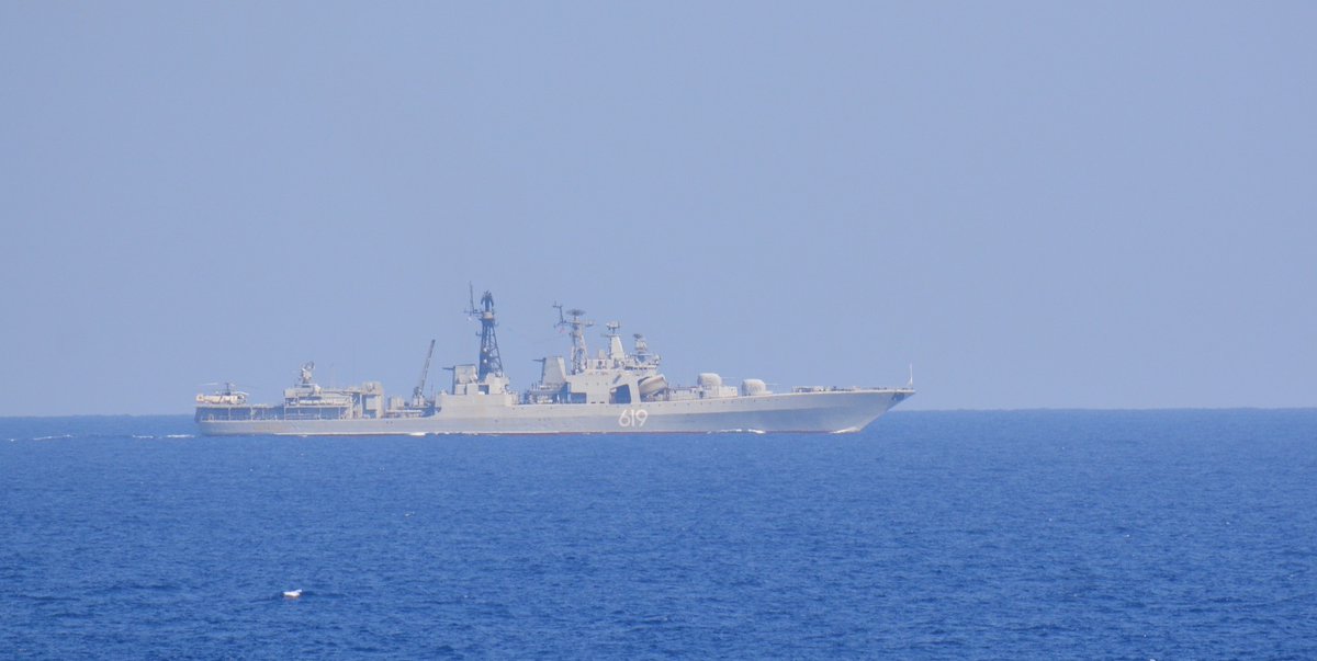 *- משחתת רוסית המשייטת במזרח הים התיכון כפי שצולמה על ידי כוח משימה של נאט”ו המשייטת באותו אזור.