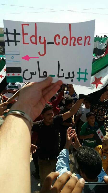 בצעד חסר תקדים הניפו מפגינים סורים גם את שמו של המזרחן הישראלי ד”ר אדי כהן תוך בקשה ממנו להפגיז את סוריה. ד”ר כהן מוכר בעולם הערבי כדוברה הלא רשמי של ישראל בתקשורת הערבית. עשרות פעמים יצא נגד שלטונו של אסד ואף קרא לחסלו.