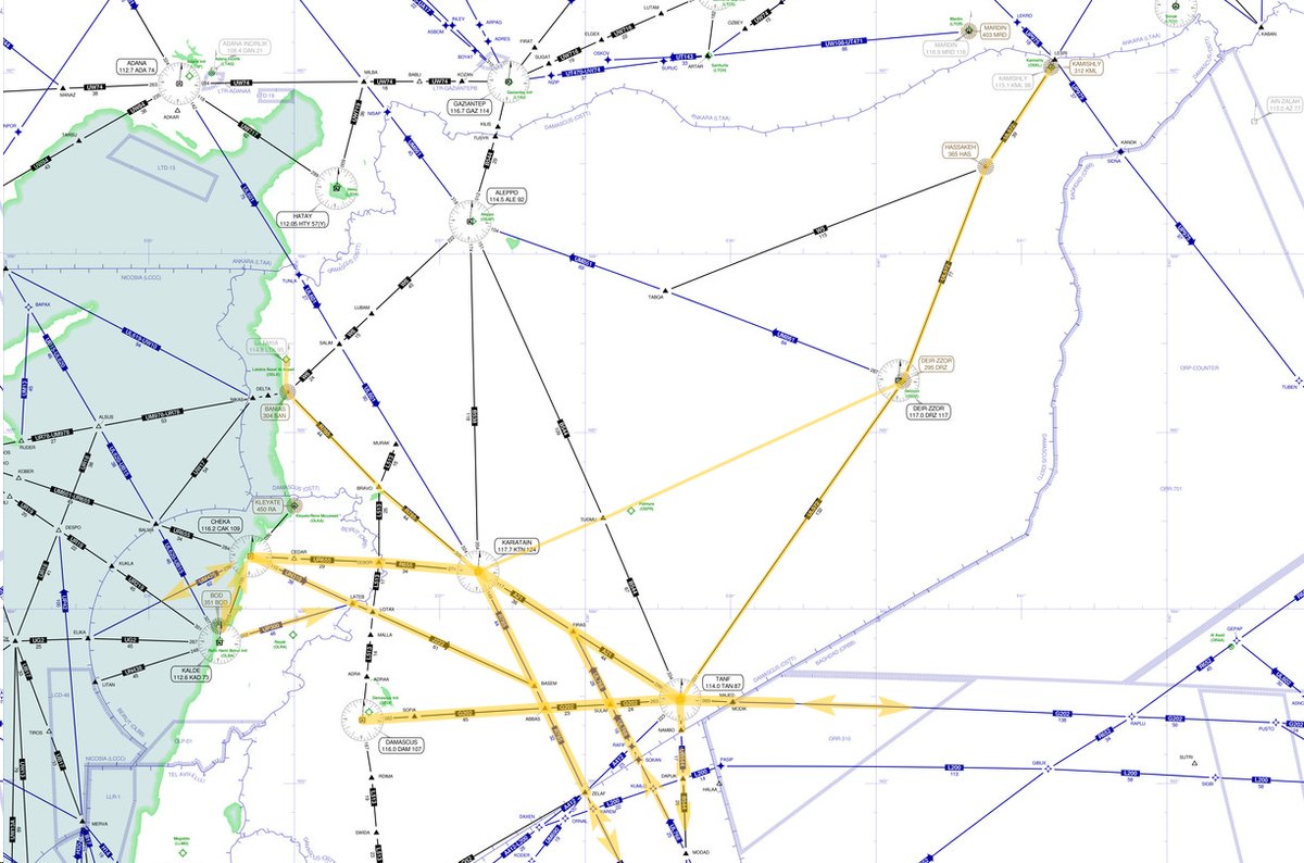 *- מפת מסדרונות האוויר לתעופה אזרחית בשמי סוריה: